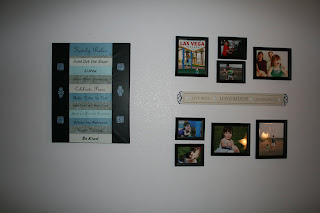 I found inspiration for the change from this blog post. The theme of the rules posted there weren’t for us, but the project concept was great. So, after some crafting, lots of consultation with Matt, a bunch of Modge Podge, and some cheapo frames and photo printing, we’ve got a wall full of family that we’re happy to look at every day.